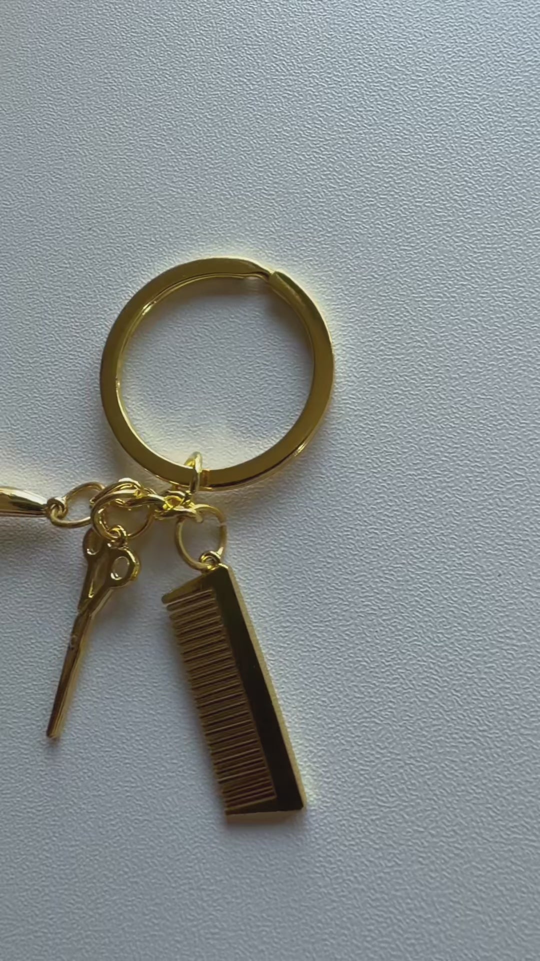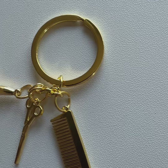 Gold color key chain with blow dryer, comb & shears charm.